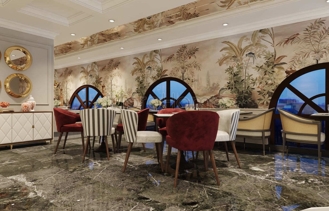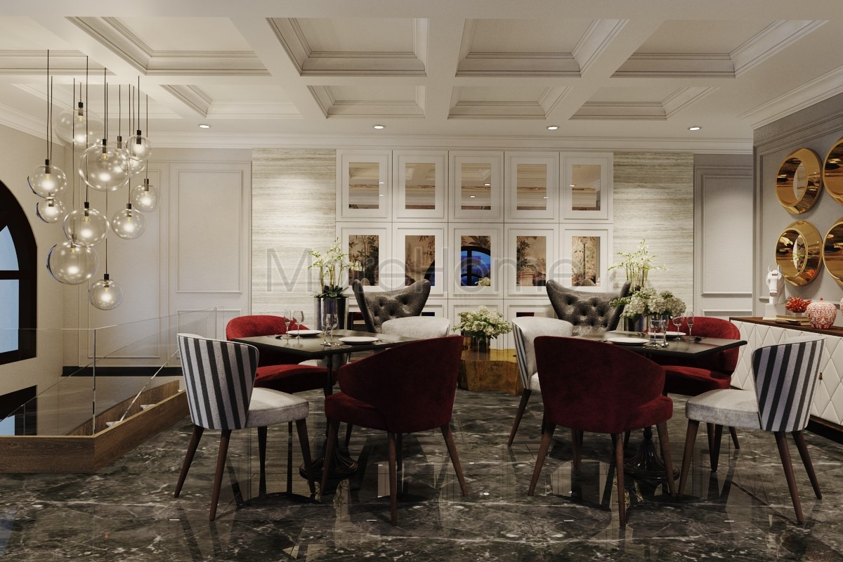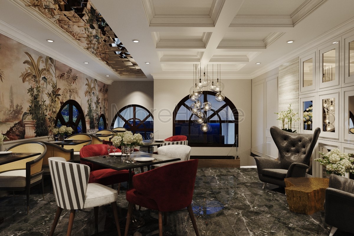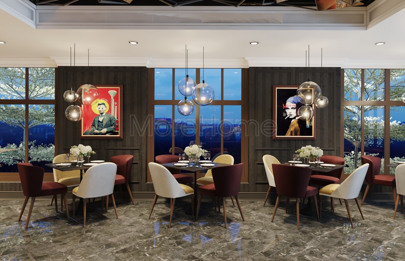 Không gian nhà hàng được thiết kế sang trọng là một trong những tiêu chí để đánh giá khách sạn cao cấp 4 sao, 5 sao. Kiến trúc sư Morehome lựa chọn thiết kế nhà hàng khách sạn ấn tượng, đặc biệt với khả năng phản xạ ánh sáng rất tốt, cho khu vực nhà hàng luôn tươi sáng, sang trọng có hơi hướng Moroccan phục vụ cho khách hàng thượng lưu.
