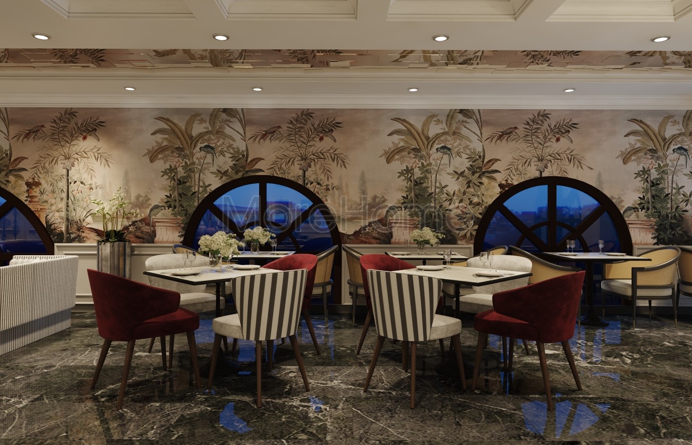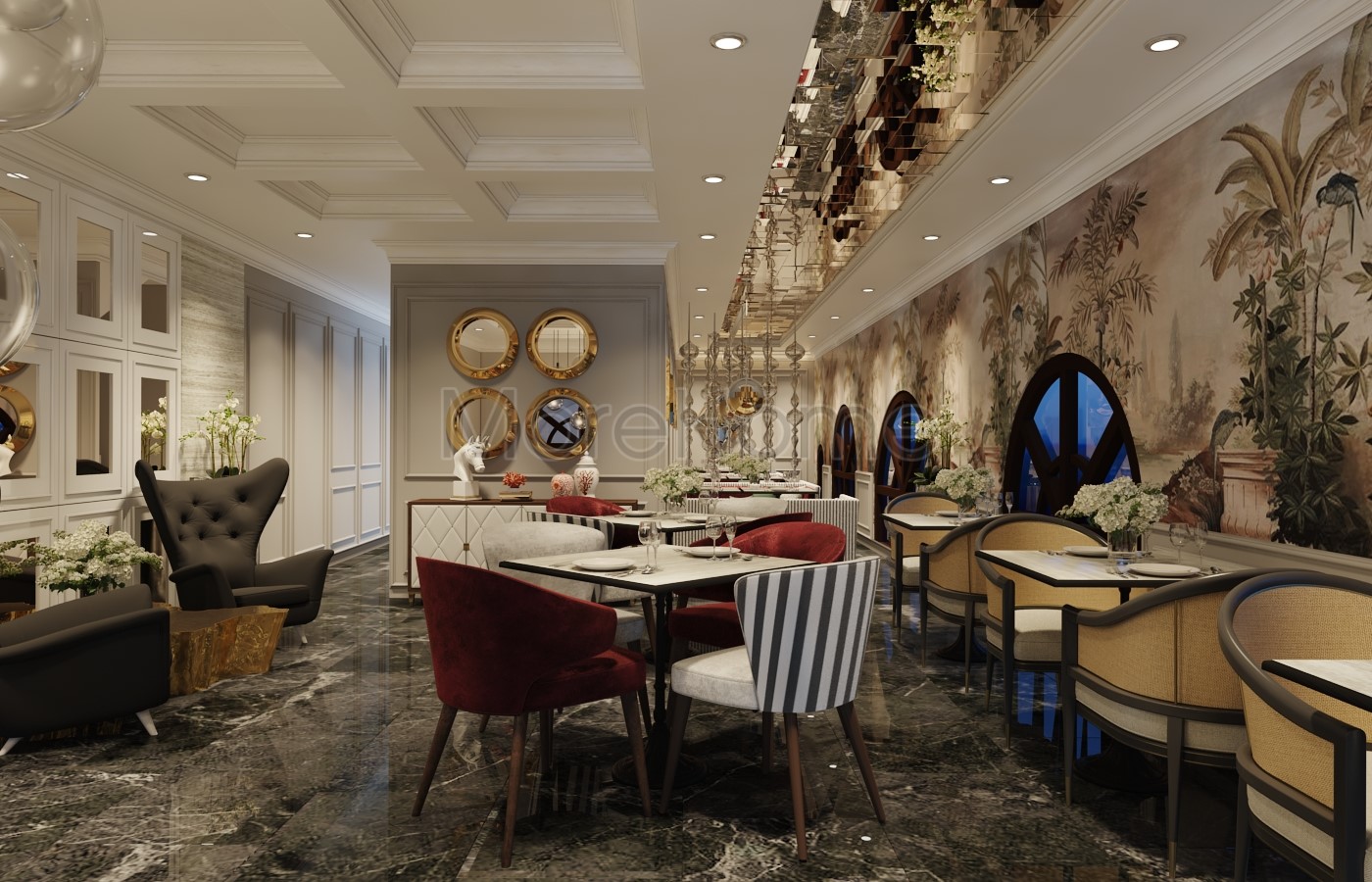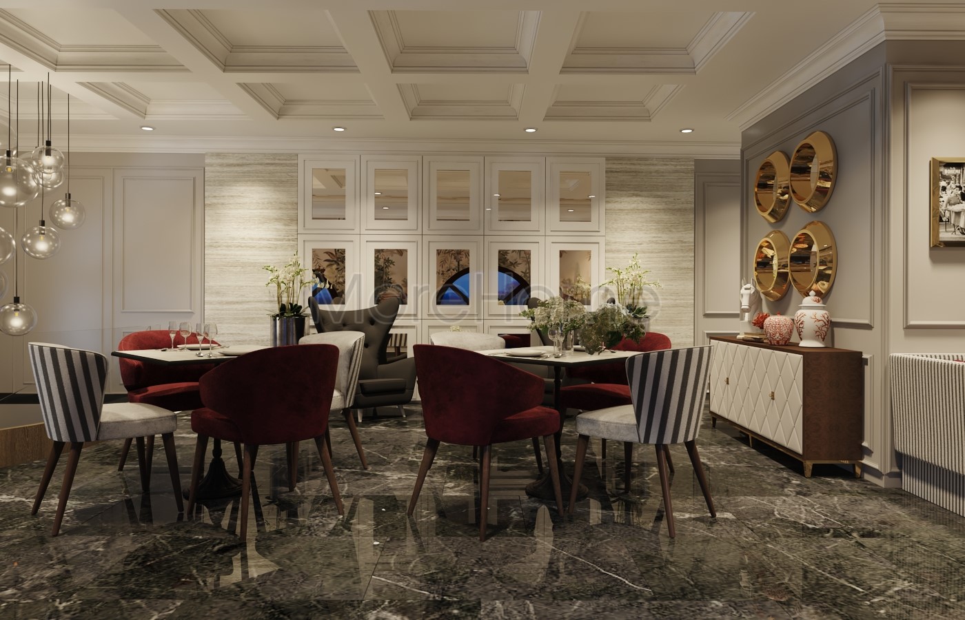 Không gian nhà hàng được thiết kế sang trọng là một trong những tiêu chí để đánh giá khách sạn cao cấp 4 sao, 5 sao. Kiến trúc sư Morehome lựa chọn thiết kế nhà hàng khách sạn ấn tượng, đặc biệt với khả năng phản xạ ánh sáng rất tốt, cho khu vực nhà hàng luôn tươi sáng, sang trọng có hơi hướng Moroccan phục vụ cho khách hàng thượng lưu.