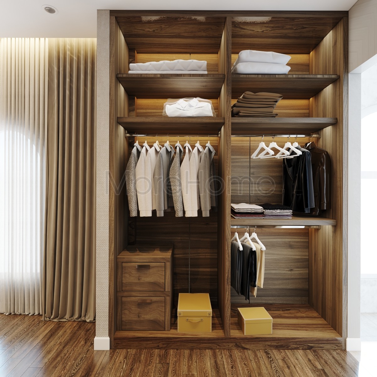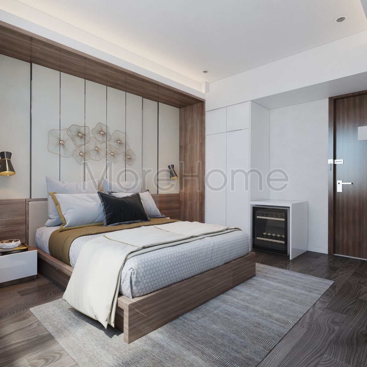 Mẫu thiết kế nội thất phòng ngủ khách sạn này cũng vô cùng đa dạng trong cách thể hiện không gian. Đối với phòng đôi vip, phòng Superior, KTS Morehome lựa chọn sử dụng gỗ melamine kết hợp với gỗ acrylic tạo cảm giác không gian rộng rãi với cách trang trí không gian tỷ mỉ, tủ quần áo liền mạch với không gian.