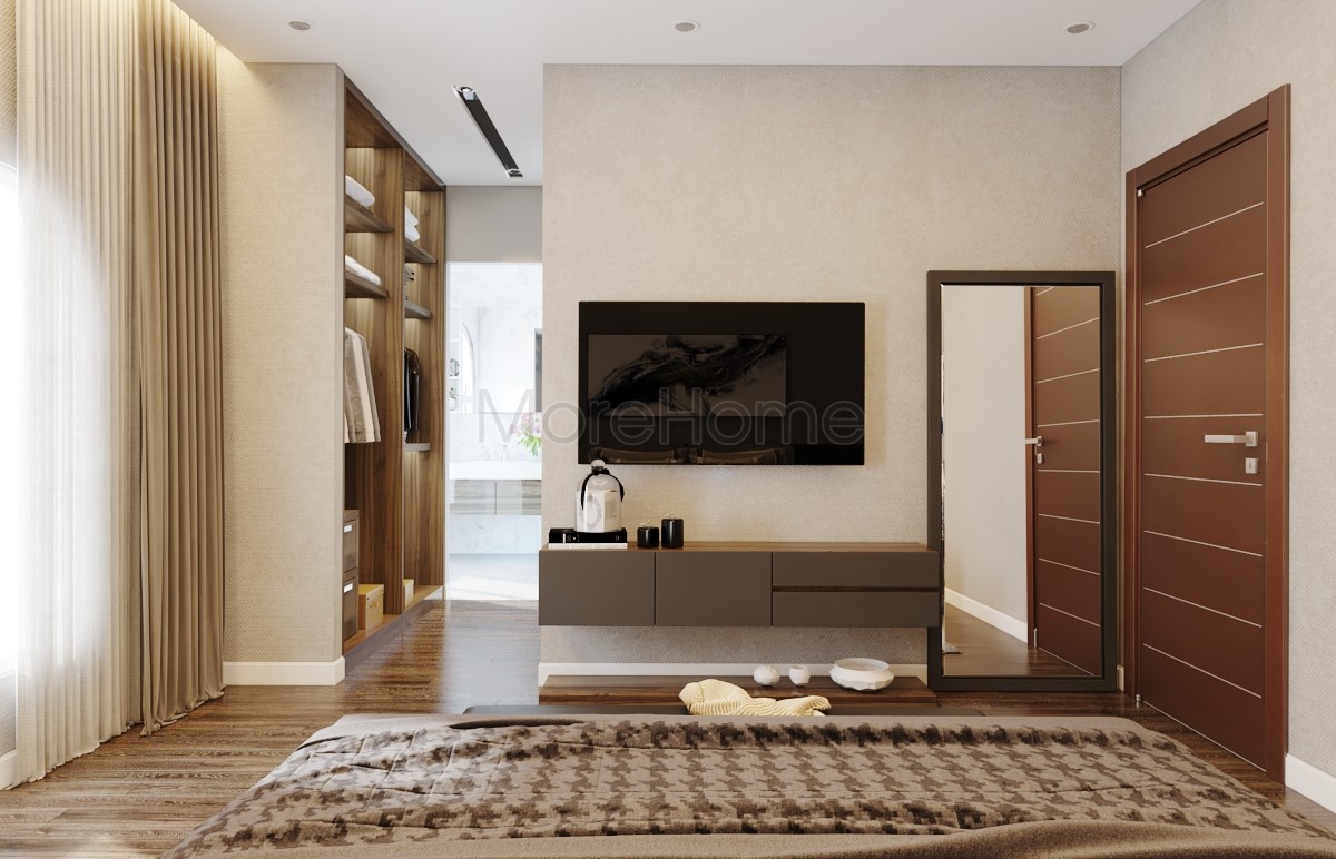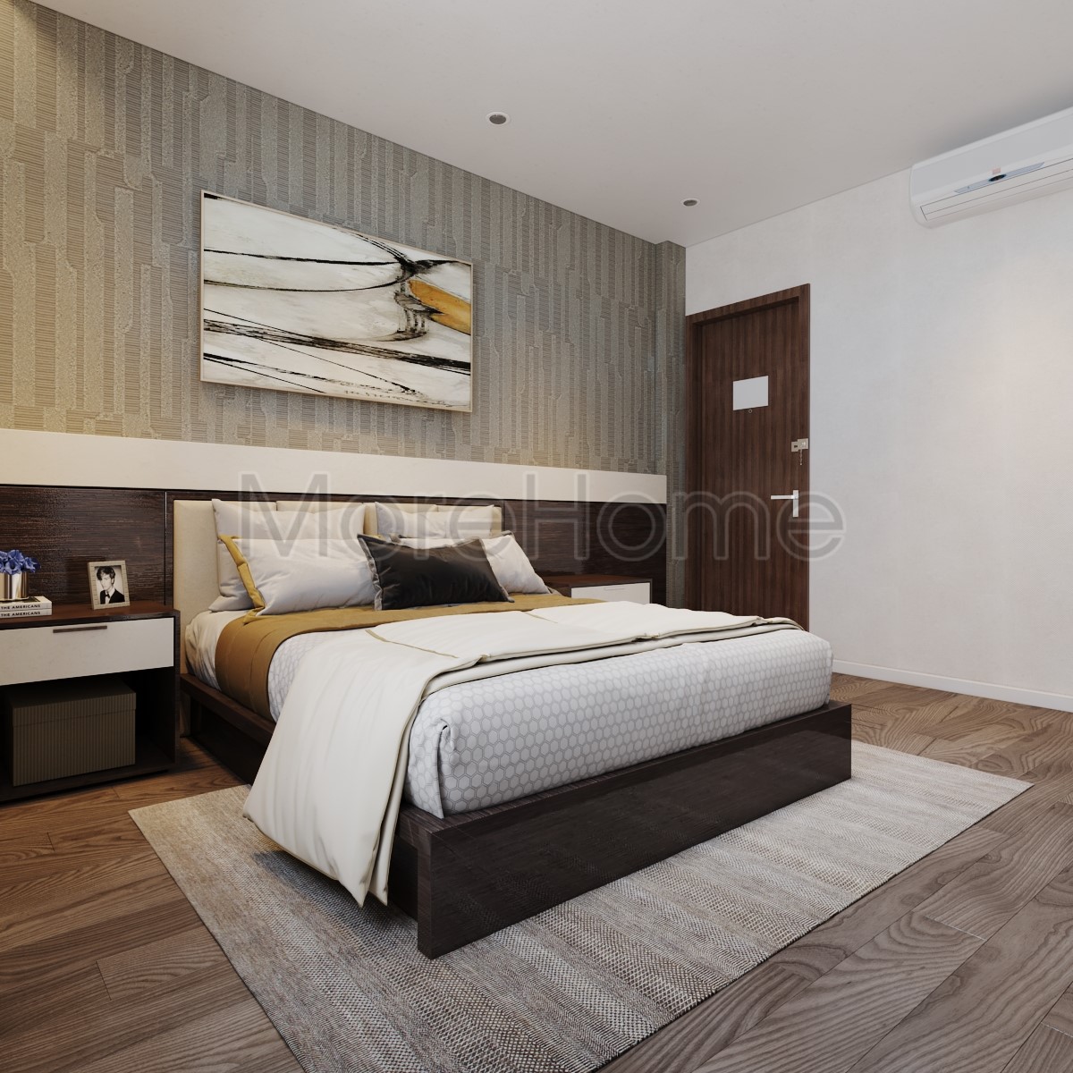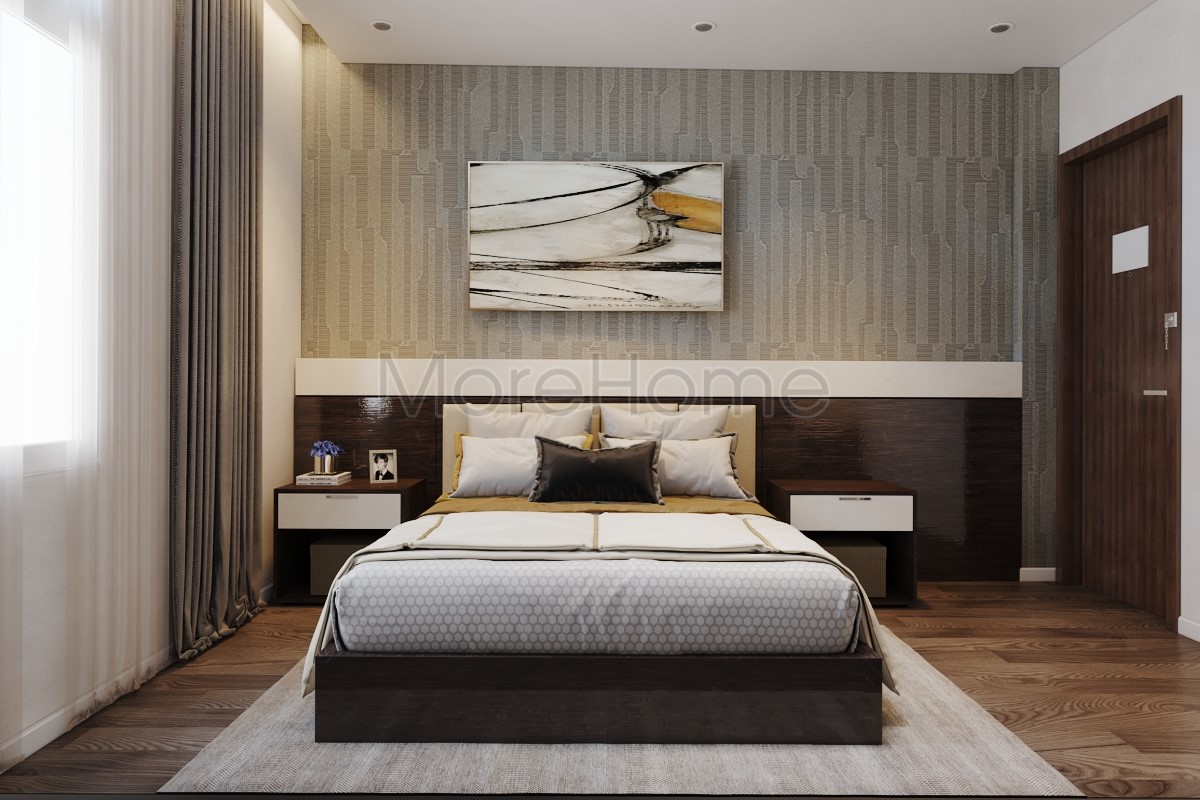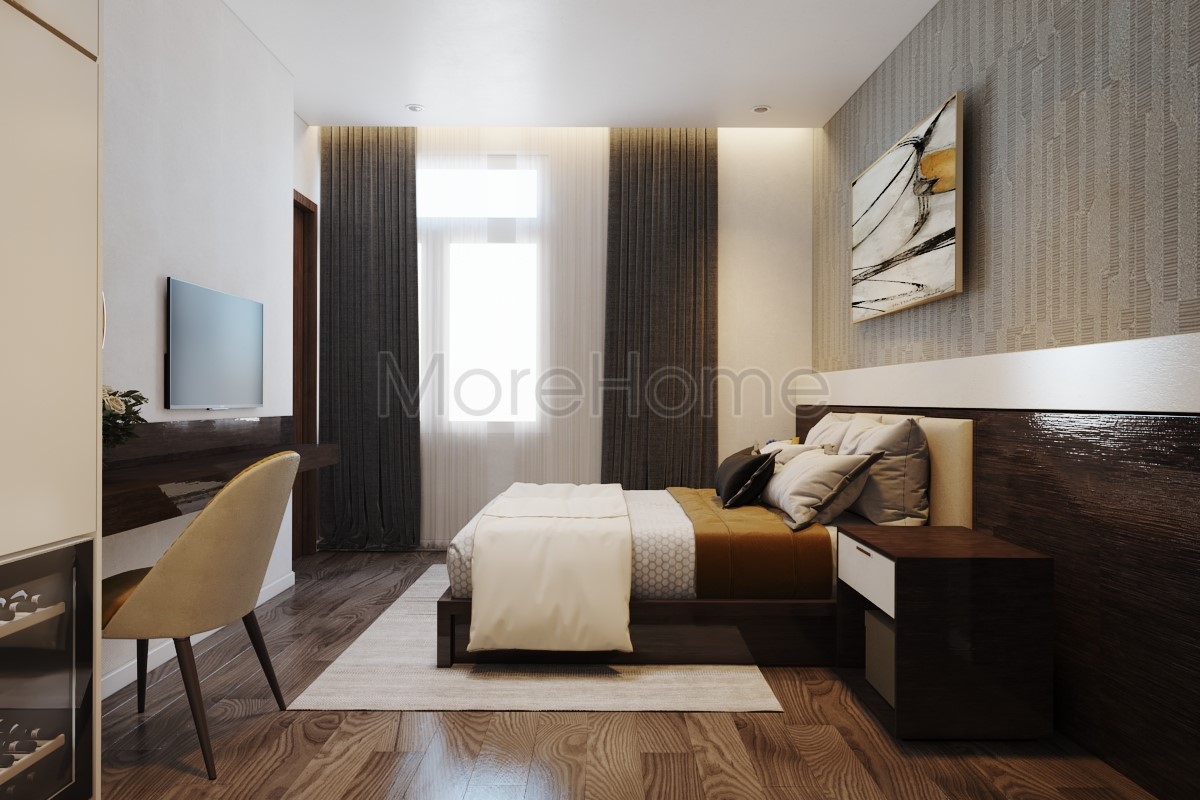 Mẫu thiết kế phòng ngủ đôi cho khách sạn với đầy đủ tiêu chuẩn đồ dùng của một khách sạn 4 sao như ghế đơn, bàn trang điểm, đèn trang trí, thiết bị giải trí, tủ đựng đồ, tủ quần áo, tranh tường,… Morehome lựa chọn màu sắc trung tính làm chủ đạo cho không gian ấn tượng, chuyên nghiệp.