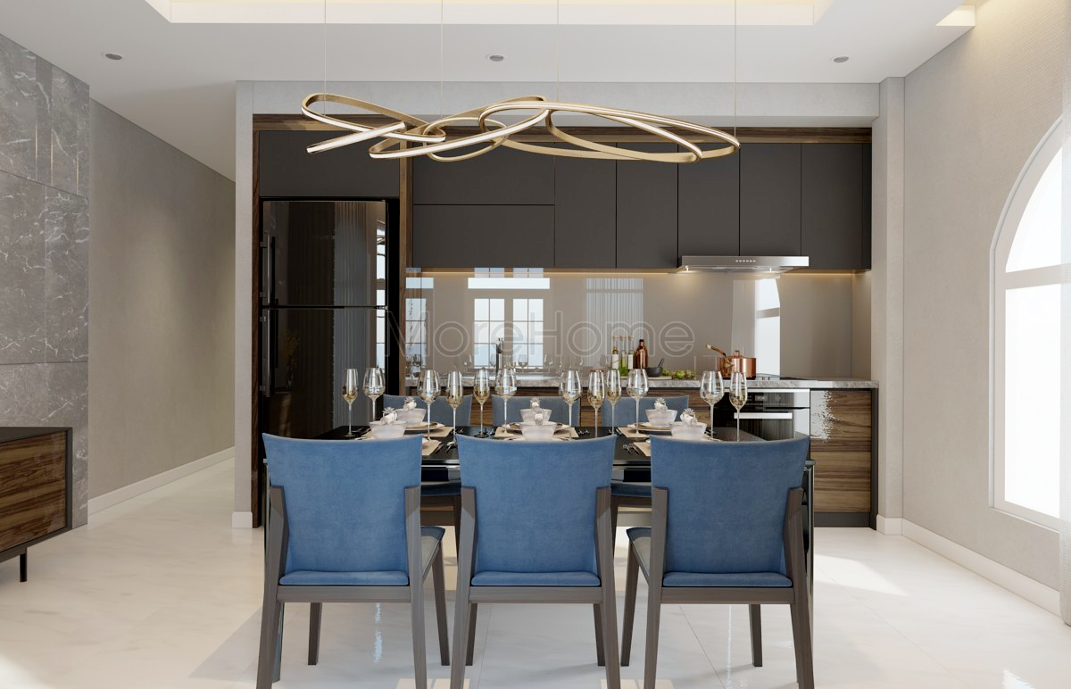 Phòng ăn được thiết kế với phong cách Moroccan được điều chỉnh từng đường nét như đèn thả trần, gương decor, tranh cũng như bộ bàn ghế nệm bàn ăn sử dụng chất liệu nỉ bọc sofa nệm cao cấp.