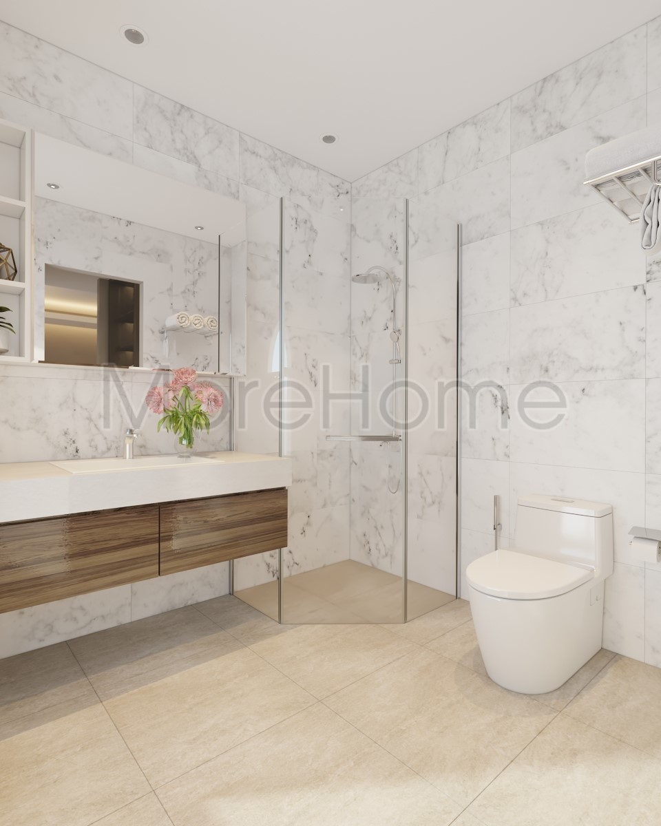 Thiết kế phòng vệ sinh với 3 khu vực tắm – rửa – xí có đầy đủ thiết bị vệ sinh cao cấp. Vách tắm kính cường lực giúp không gian phòng mở rộng hơn.
