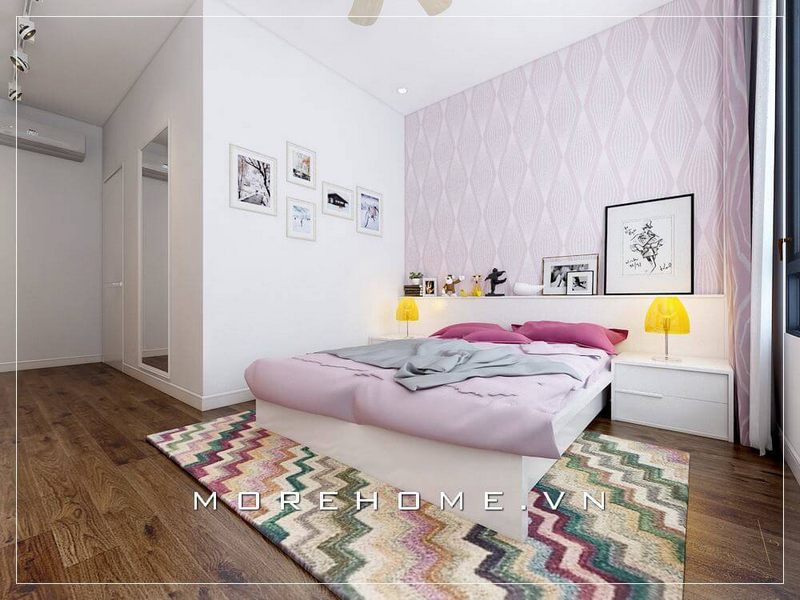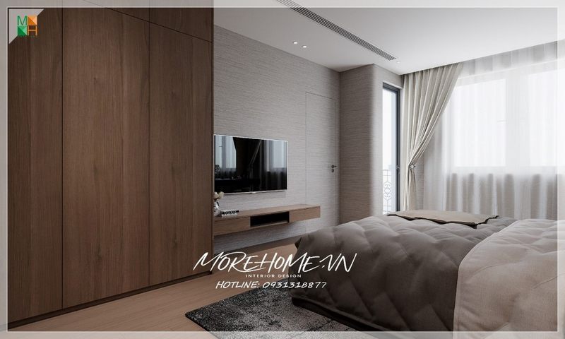 Thiết kế nội thất phòng ngủ chung cư hiện đại, đơn giản với mẫu giường ngủ gỗ công nghiệp dáng thấp thanh mảnh nhưng lại chắc chắn, an toàn