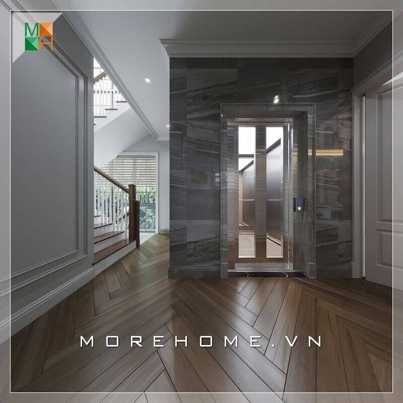 Trong thiết kế nội thất của biệt thự phần tường thang máy thường sử dụng đá ốp với những đường vân độc đáo đem lại sự sang trọng cho toàn bộ không gian.