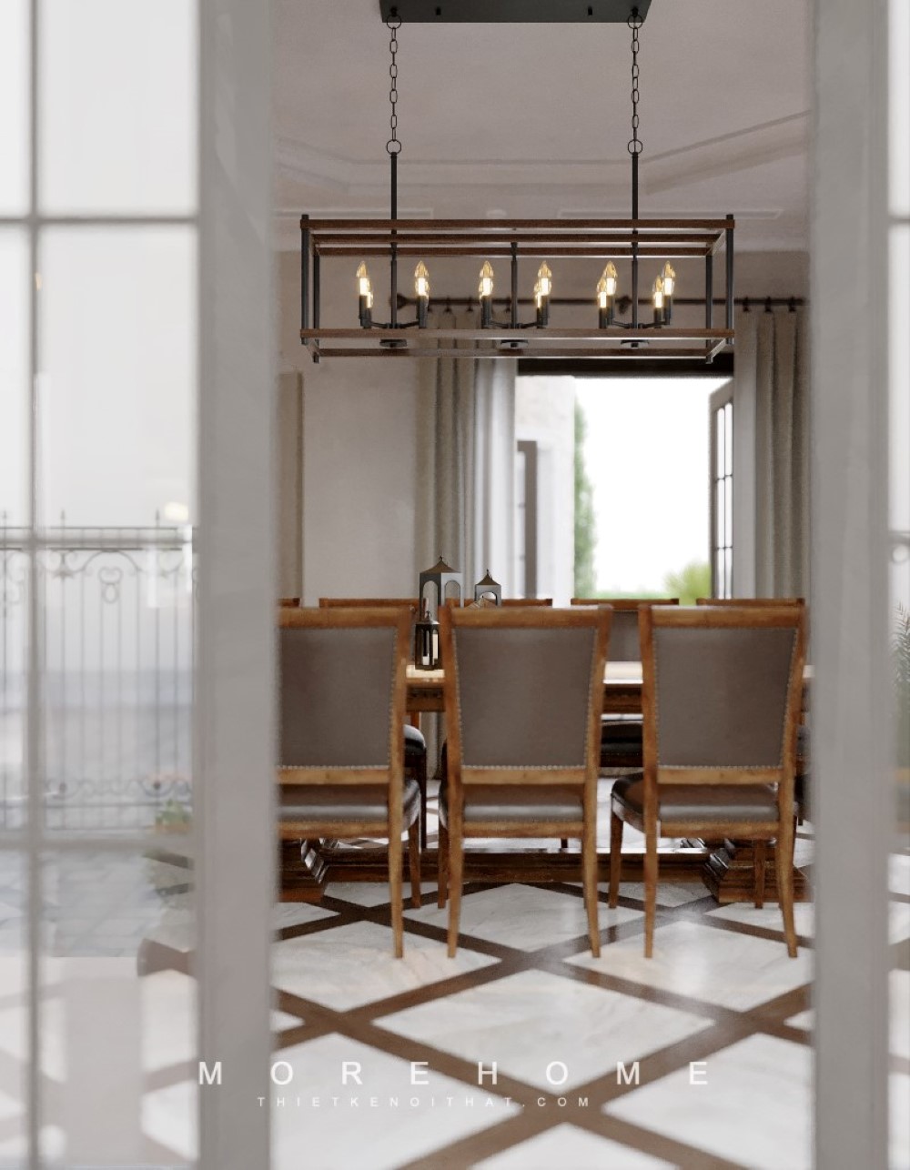 Trang trí nội thất phòng ăn đẹp với bộ bàn ăn dành cho 8 thành viên, chiếc đèn thả trần nghệ thuật, gạch lát nền giả đá màu nâu cao cấp, tủ gỗ kết hợp kính có gắn đèn led để đồ hiện đại.