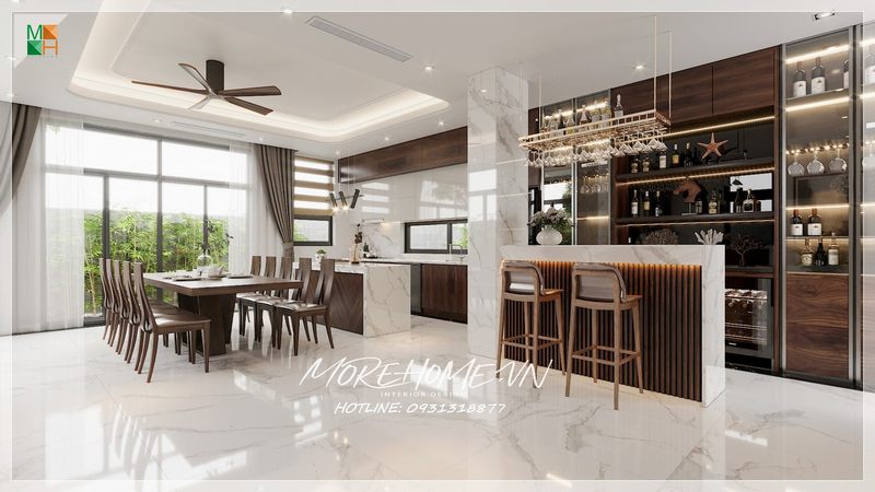 Ý tưởng trang trí nội thất phòng bếp - ăn cho biệt thự, nhà phố hiện đại. Rộng rãi mà vẫn thể hiện được sự đẳng cấp của người sở hữu nhờ đồ nội thất gỗ óc chó nâu cao cấp