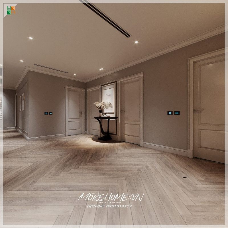 Sảnh biệt thự trở nên sang trọng nhờ lát sàn gỗ xương cá