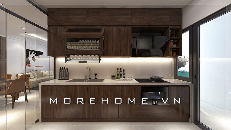 Mẫu tủ bếp gỗ công nghiệp màu nâu đơn giản cùng thiết bị bếp hiện đại tạo không gian nấu nướng tiện nghi cho người nội trợ