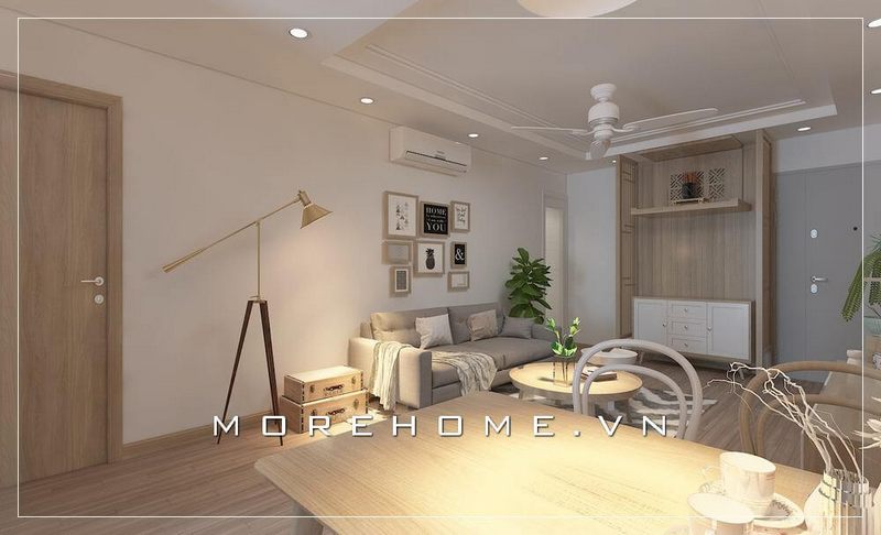 Khu vực phòng khách chung cư được thiết kế theo lối hiện đại với nội thất gỗ công nghiệp tạo cảm giác tinh tế và thoáng máy
