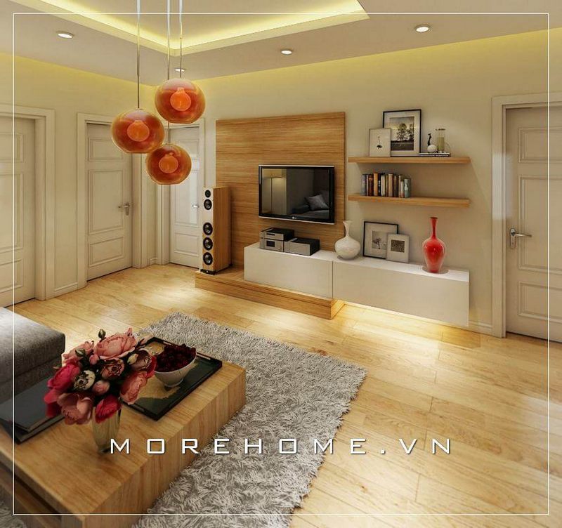 Không gian phòng khách căn hộ được thi công với mẫu tủ tivi và bàn trà bằng gỗ công nghiệp cao cấp