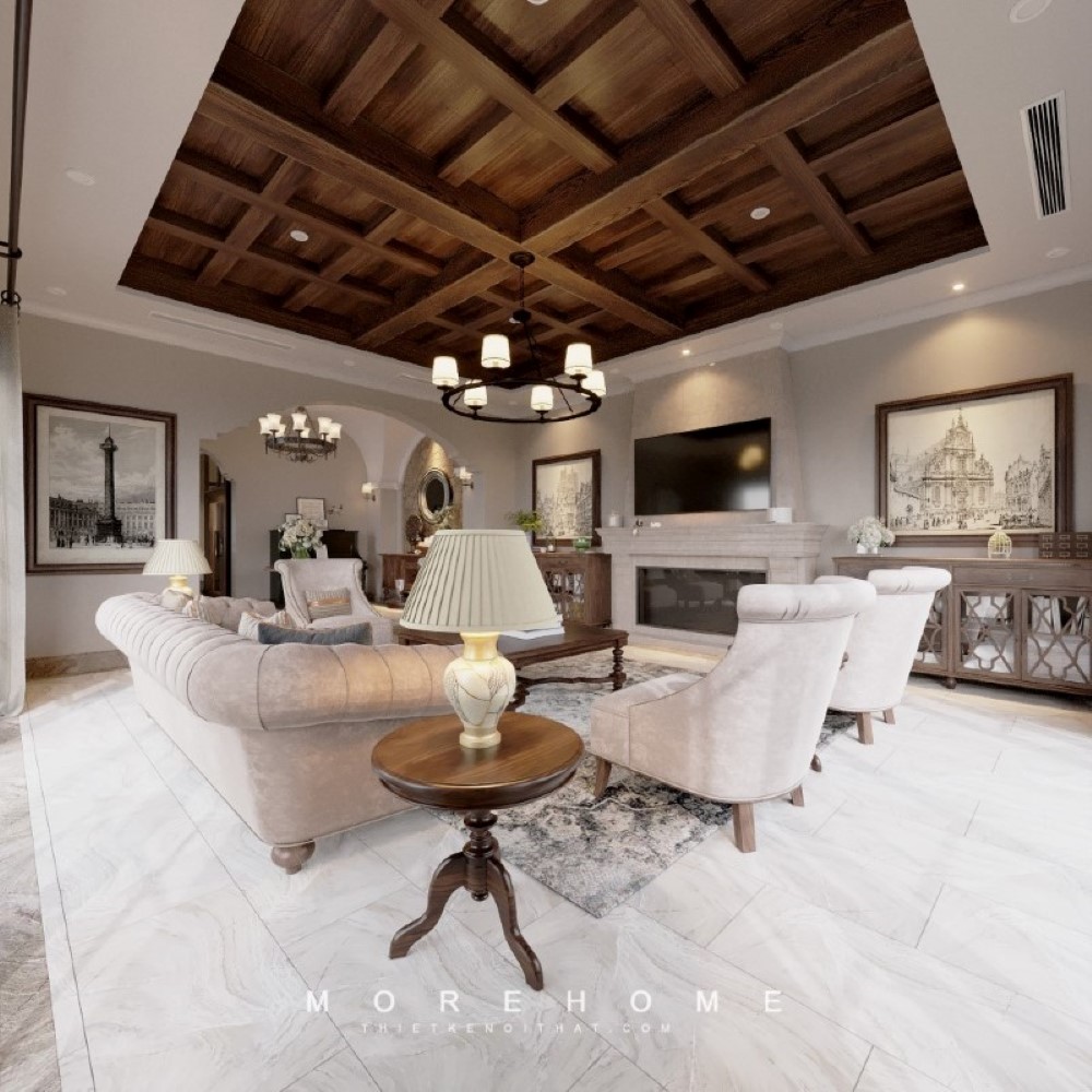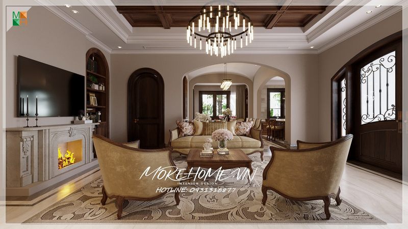 Thiết kế phòng khách biệt thự, nhà phố được bố trí nổi bật với bộ sofa gỗ óc chó phong cách tân cổ điển mang đến không gian sự sang trọng, đẳng cấp đầy cuốn hút.