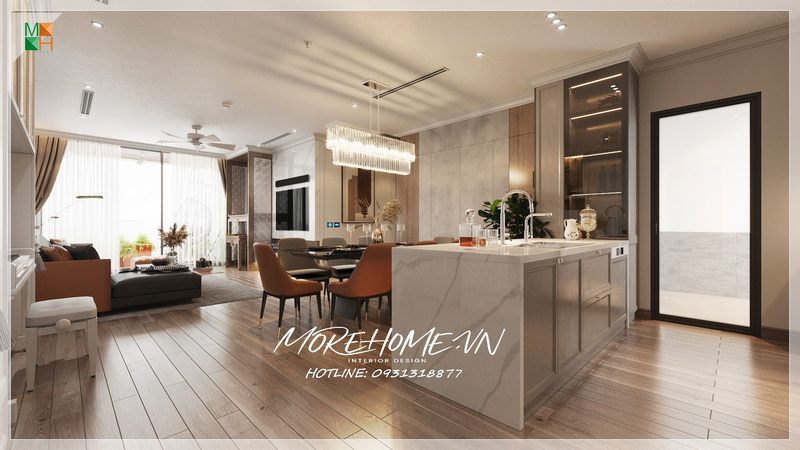 Nhìn tổng thể không gian nhà mang phong cách tân cổ điển kết hợp nhuần nhuyễn với chút hiện đại của nội thất làm cho căn hộ chung cư trở nên đẹp, lạ và thu hút.