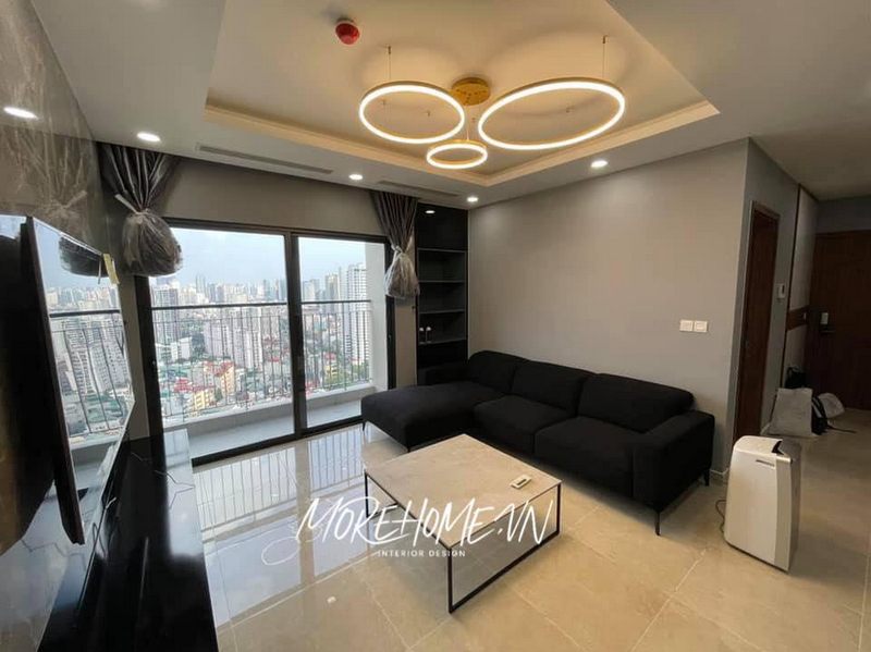 Những bóng đèn hiện đại, cũng tạo ra điểm nhấn cho phòng khách căn hộ ánh sáng vàng tạo cảm giác không chói mắt.