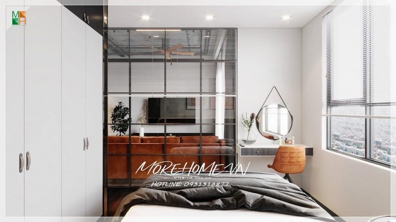 Phòng khách căn hộ được ngăn cách với các phòng khác của hộ bằng lớp kính vách ngăn trong suốt tạo độ thoáng cho chung cư