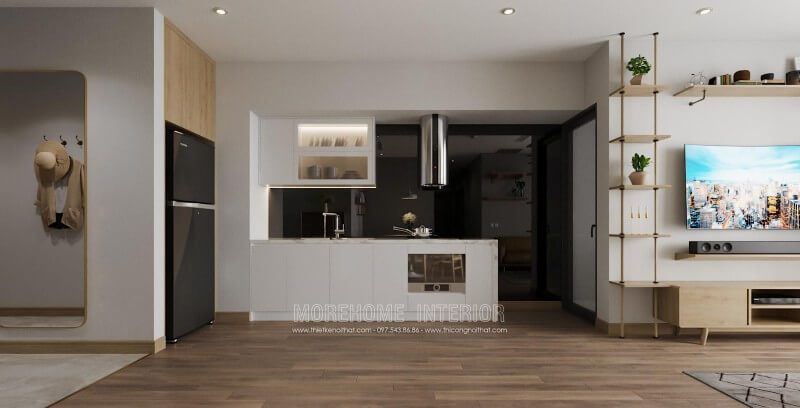 Thiết kế nội thất phòng bếp của chung cư với gam màu trẻ trung, sang trọng và tinh tế.
