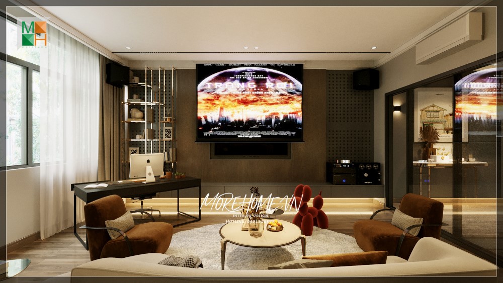 Không gian hành lang tầng biệt thự được chuyển đổi thành một không gian phòng khách nhỏ hoặc một phòng sinh hoạt chung dành cho toàn bộ gia đình.
